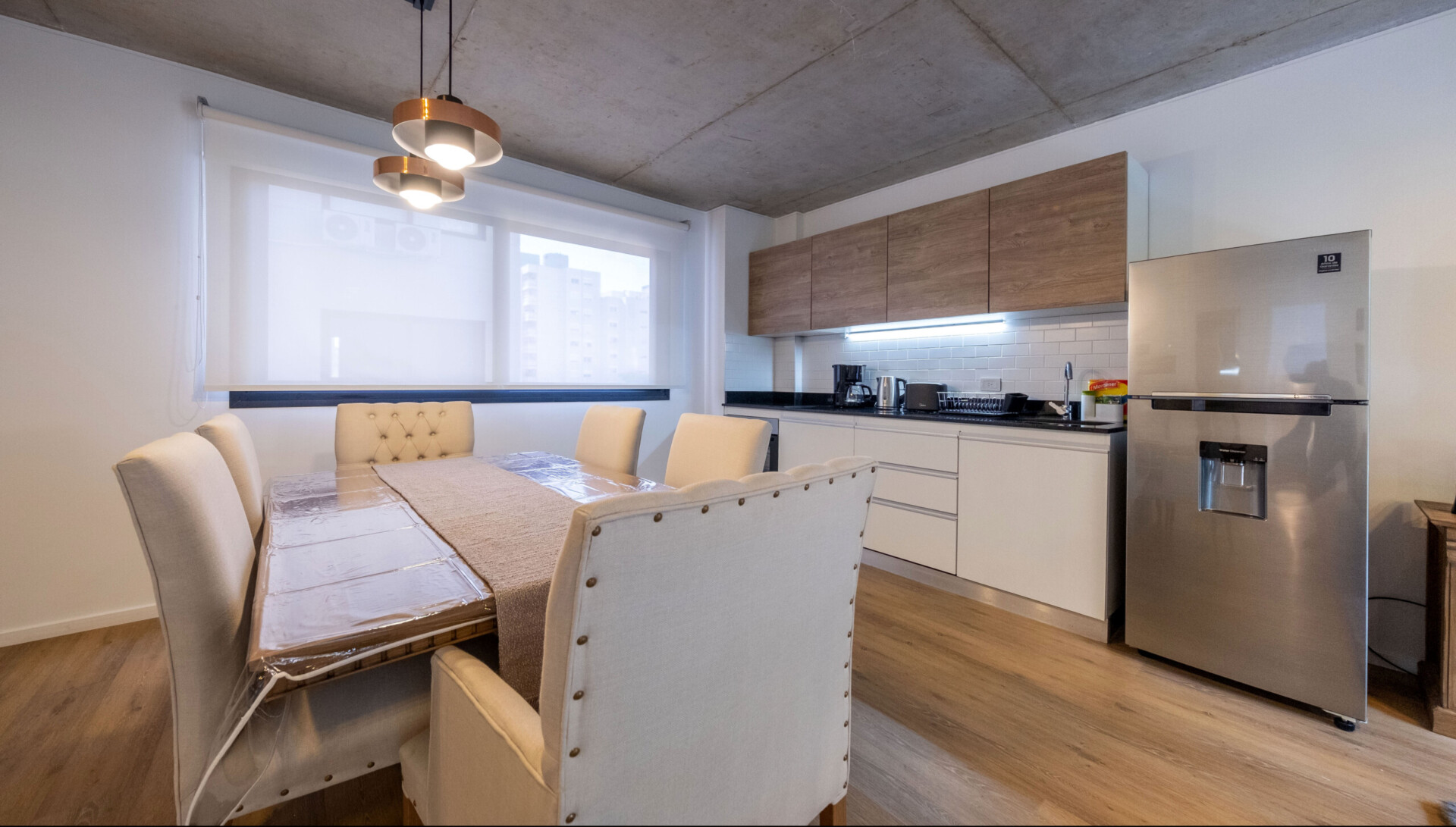 Living/Comedor: Posee un sofá cama para un tercer huésped (130 x 185 cms.), una smart-tv de 50″ con señal de cable. Una mesa con seis sillas. Un escritorio con silla y velador. Cuenta con un aire acondicionado frío/calor y ventanal con salida al balcón.