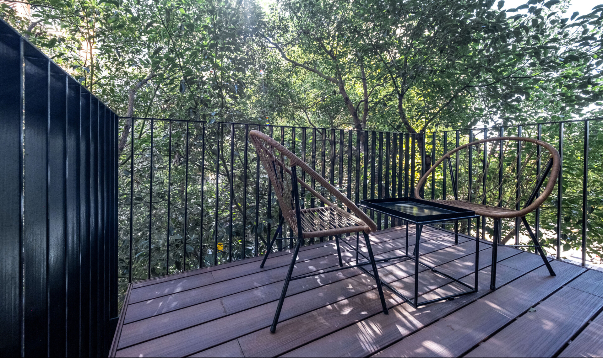 Balcón: Posee una mesa con dos sillas y una hermosa arboleda.