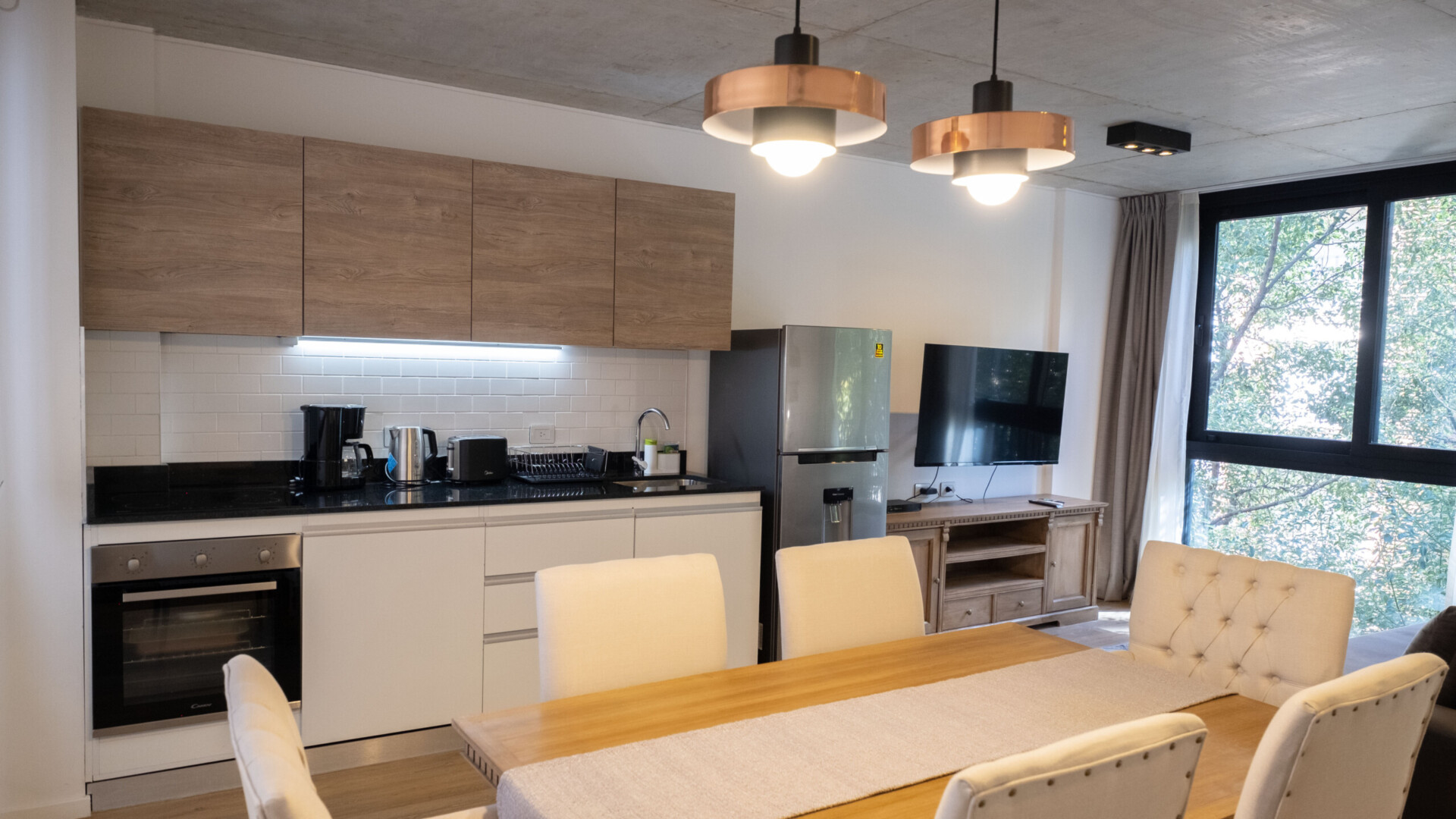 Cocina integrada: Todos los electrodomésticos esenciales: heladera, freezer, horno eléctrico, microondas, tostadora, pava eléctrica, cafetera, juego de ollas, sartenes, vajilla completa, utensilios, cubiertos y bacha.